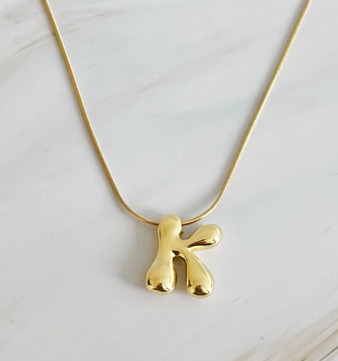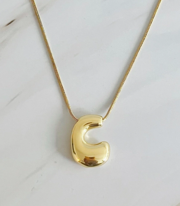 - Introducing our unique and fashion-forward Balloon Letter Initial Necklace. With its simple yet chic design, this necklace is the perfect accessory for any outfit. Made with quality materials, it is the perfect combination of style and sophistication. 16" with a 2" extender 18k gold plated brass for pendant, gold plated stainless steel chain Lead and Nickel fre